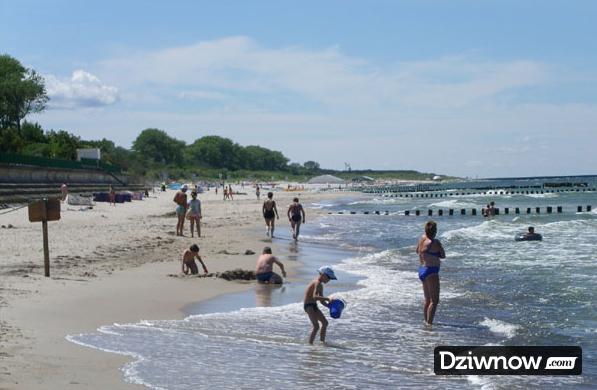 Plaża strzeżona z jasnym, drobnym piaskiem oddzielona od miasta pasmem wydm. Zainteresowanie wypoczywających wzbudzają stojące tu kutry rybackie. Dzieci latem na plaży mają do dyspozycji dmuchane konstrukcje do skakania i zjeżdżalnię wodną. Z morza wystające falochrony w postaci drewnianych palików są miejscem spoczynku mew. Na zachodnim krańcu plaży, przy ujściu Dziwny znajdują się dwa falochrony zbudowane w końcu XIX w. Jest to dobre miejsce do wędkowania.